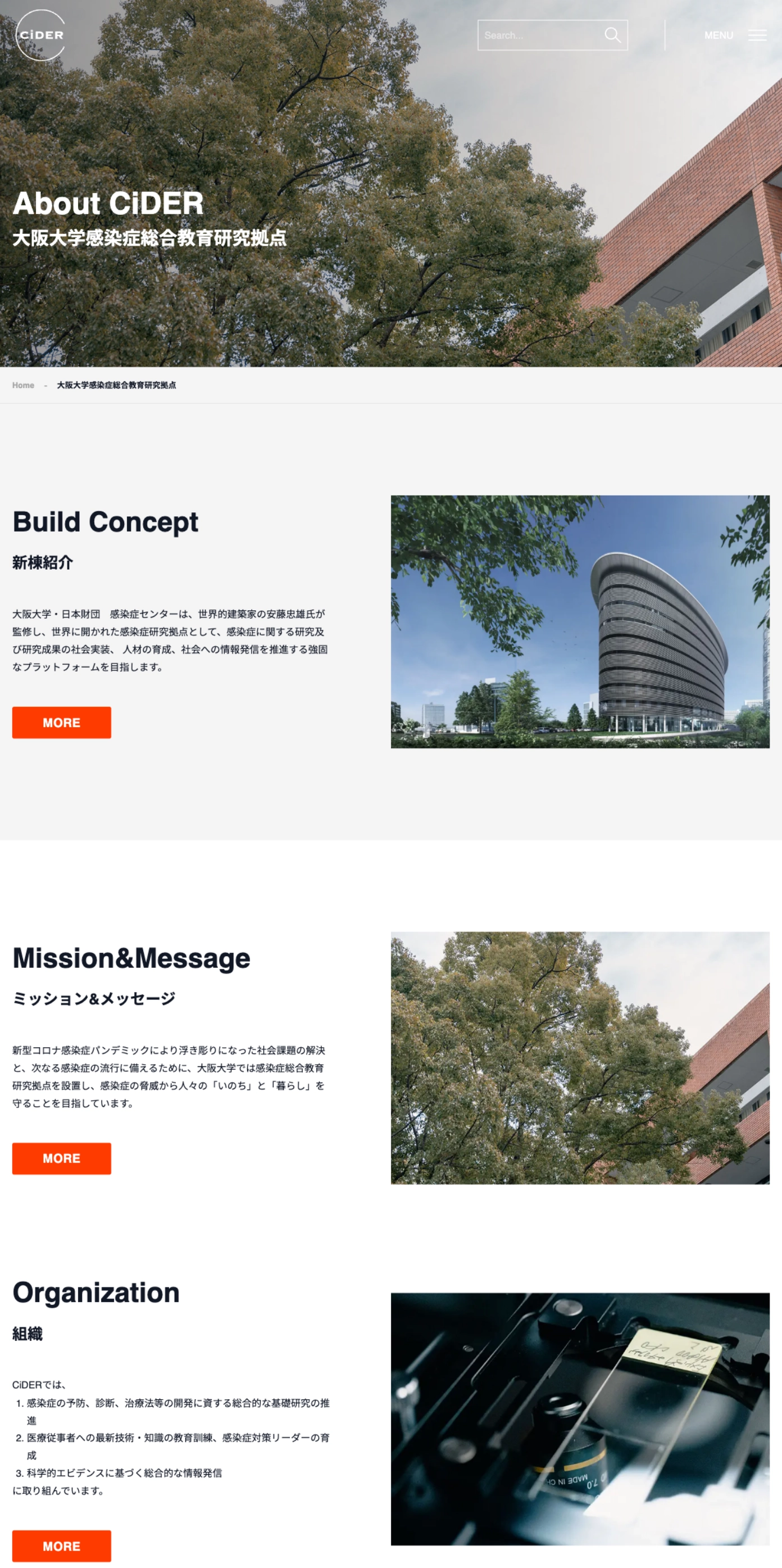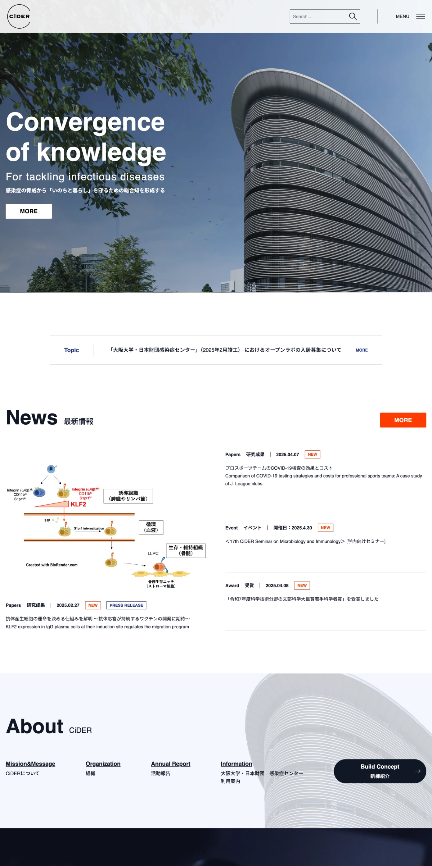 大阪大学CiDER様のWebサイトを制作。3つのコンセプト案から選定いただき、Jamstack構成でセキュリティとパフォーマンスを両立したサイトを構築しました。SEO設計も施し、公開後まもなくアクセス数が約3倍に増加し、その後も高い水準を維持。 Web制作だけでなく、安藤忠雄氏設計の建物で行われたセレモニー動画、研究者インタビュー、東京で開催されたシンポジウム用ポスターや動画など、多岐にわたるクリエイティブを担当。研究機関としてのブランド価値向上と情報発信の基盤づくりに伴走しました。