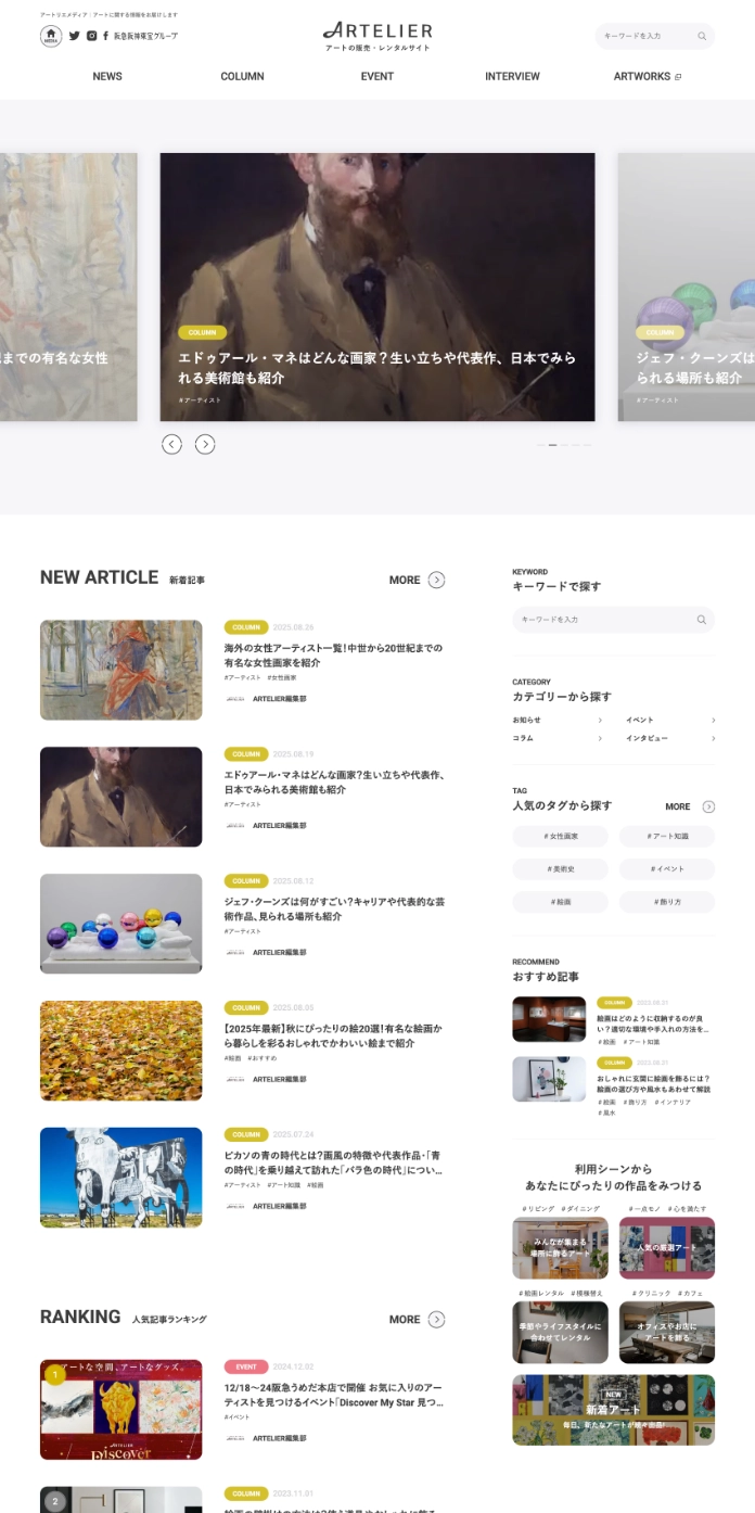 アートリエ様のメディアサイト構築を担当しました。単なる情報掲載の場ではなく、「継続的にアクセスを集め、暮らしとアートをつなぐ」をテーマに設計しています。 公開後もアクセス数の成長を計測・分析し、SEOを踏まえたカテゴリ設計や記事の見せ方を工夫。さらに、さまざまな課題を社内でブレストし、ひとつずつ解決しながらアクセスを着実に伸ばしてきました。成約への導線もテストを重ねることで、売上に直結するメディアサイトへと成長しています。 メディアサイトとしての基盤を固めることで、公開後もアクセスを伸ばし続け、ブランド価値の向上に貢献しています。