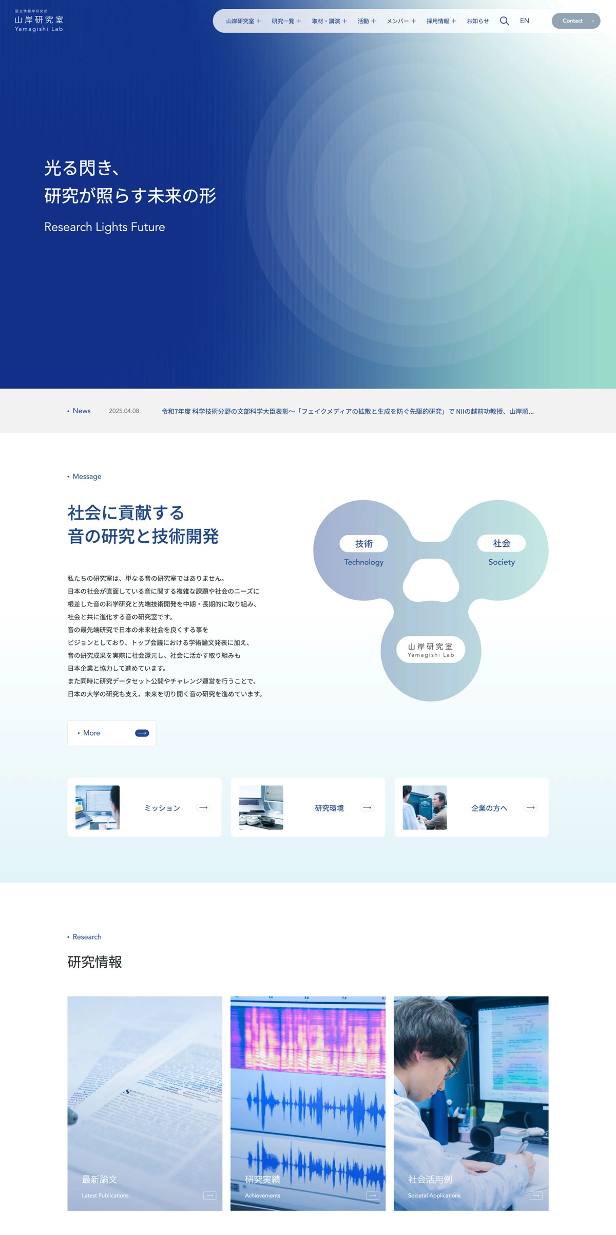 「光る閃き、研究が照らす未来の形 Research Lights Future」 社会に貢献する音の研究と技術開発 私たちの研究室は、単なる音の研究室ではありません。 日本の社会が直面している音に関する複雑な課題や社会のニーズに 根差した音の科学研究と先端技術開発を中期・長期的に取り組み、 社会と共に進化する音の研究室です。 音の最先端研究で日本の未来社会を良くする事を ビジョンとしており、トップ会議における学術論文発表に加え、 音の研究成果を実際に社会還元し、社会に活かす取り組みも 日本企業と協力して進めています。 また同時に研究データセット公開やチャレンジ運営を行うことで、 日本の大学の研究も支え、未来を切り開く音の研究を進めています。