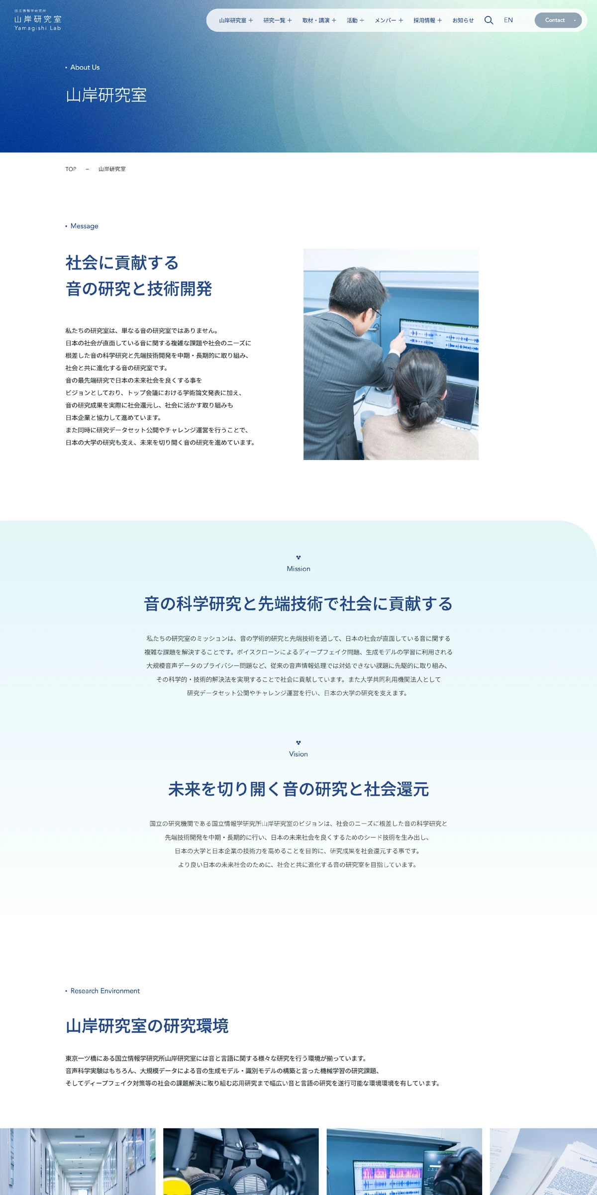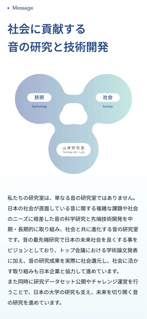 AIと音の研究を行う山岸研究室様のWebサイトを制作。研究内容は難解になりがちですが、未来を感じるワクワク感と研究室のあたたかい雰囲気が伝わるよう、コンセプトメッセージからサイト構造までゼロから提案しました。 現場での写真撮影も実施し、研究風景やメンバーの表情を大切にしながら、音の研究をイメージできるマテリアルやビジュアルを構成。研究紹介だけでなく、研究室で働く魅力が直感的に伝わるデザインに仕上げました。